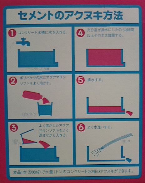 アクアマリンソフトは500ccで水量1トンのコンクリート水槽のアク抜きが短時間で しかも簡単にできます。コンクリート水槽に水をはり その水をバケツに八分目ほど取って その中によく溶かしたアクアマリンソフトをコンクリート水槽の中へよく混ぜながら徐々に入れ充分混ぜてください。