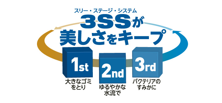大きなゴミを取り除き(物理ろ過)、水の汚れを分解する(生物ろ過)微生物繁殖に適した目詰まりしにくい特殊3層構造のマットです。
